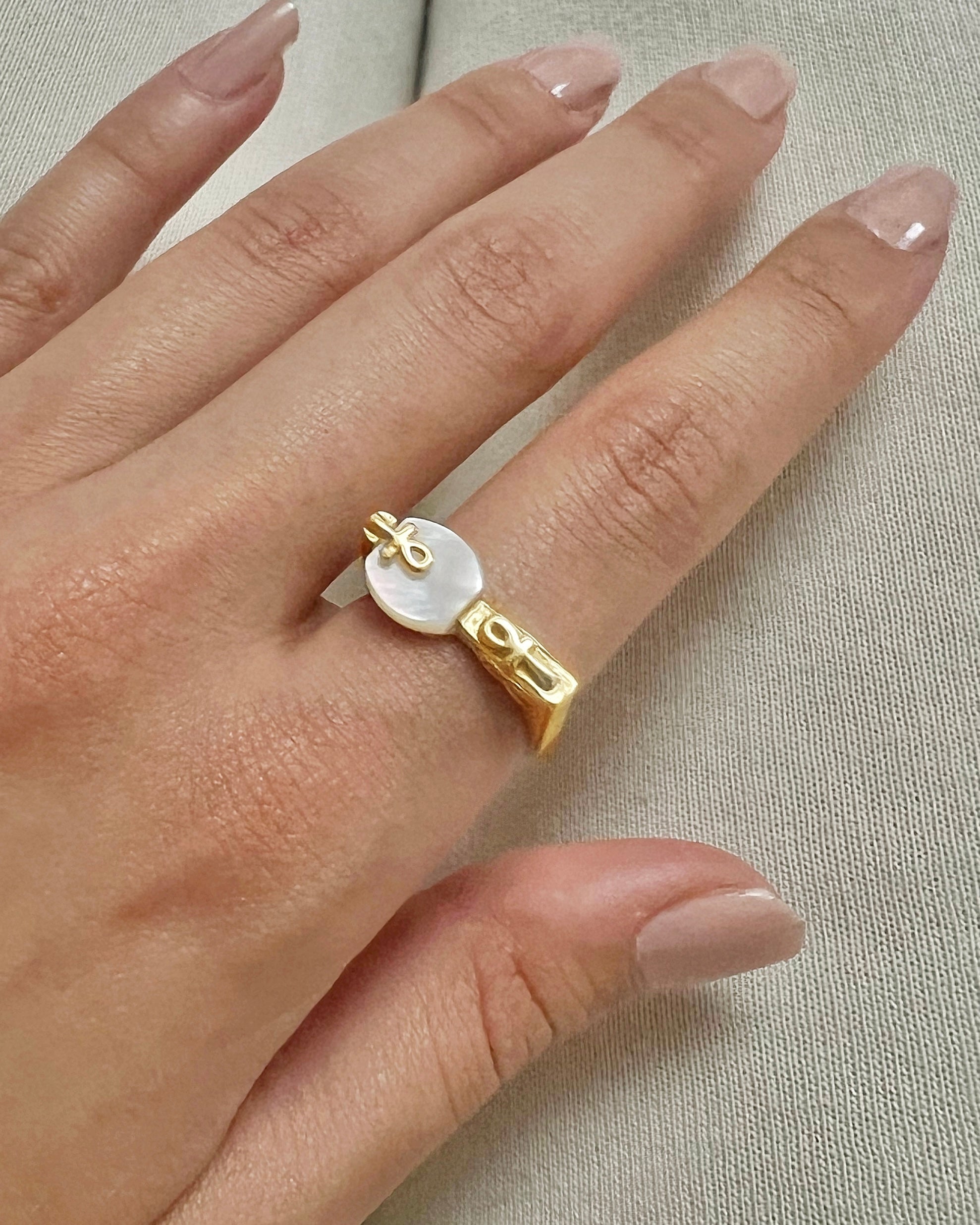 A 925k handcrafted sterling silver royal ring , with natural mother of pearl stone adorned with Gold vermeil.