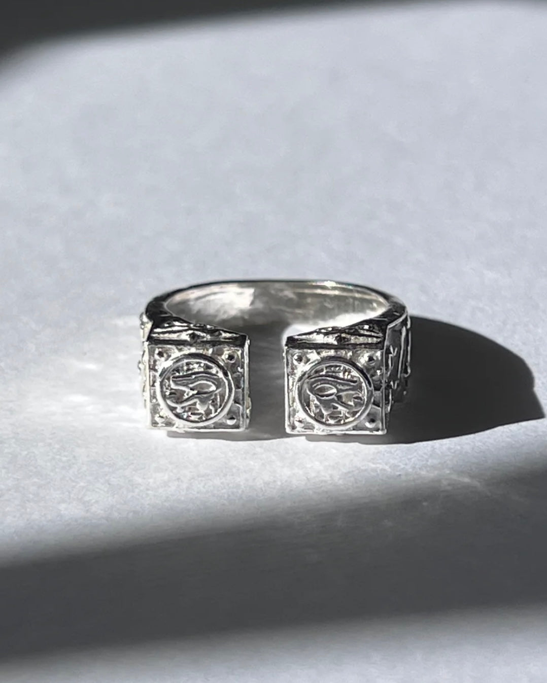 a royal design that brings together our signature Horus eyes with Ankh and scarab designs, a ring that is full of details that represents an ancient Egyptian touch, handcrafted by craftsmen.